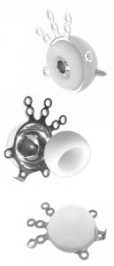 – La copa CAPITOLE R está indicada en protuberancias masivas del acetábulo. Su gancho obturador permite encontrar el centro de rotación articular. Sus 3 pestañas a presión proximales estabilizan los injertos y fijan la versión de copa. 2 patas adaptables orientadas a las 5 y las 7 en punto estabilizan los injertos y bloquean el cotilo en su plano de anteversión.
