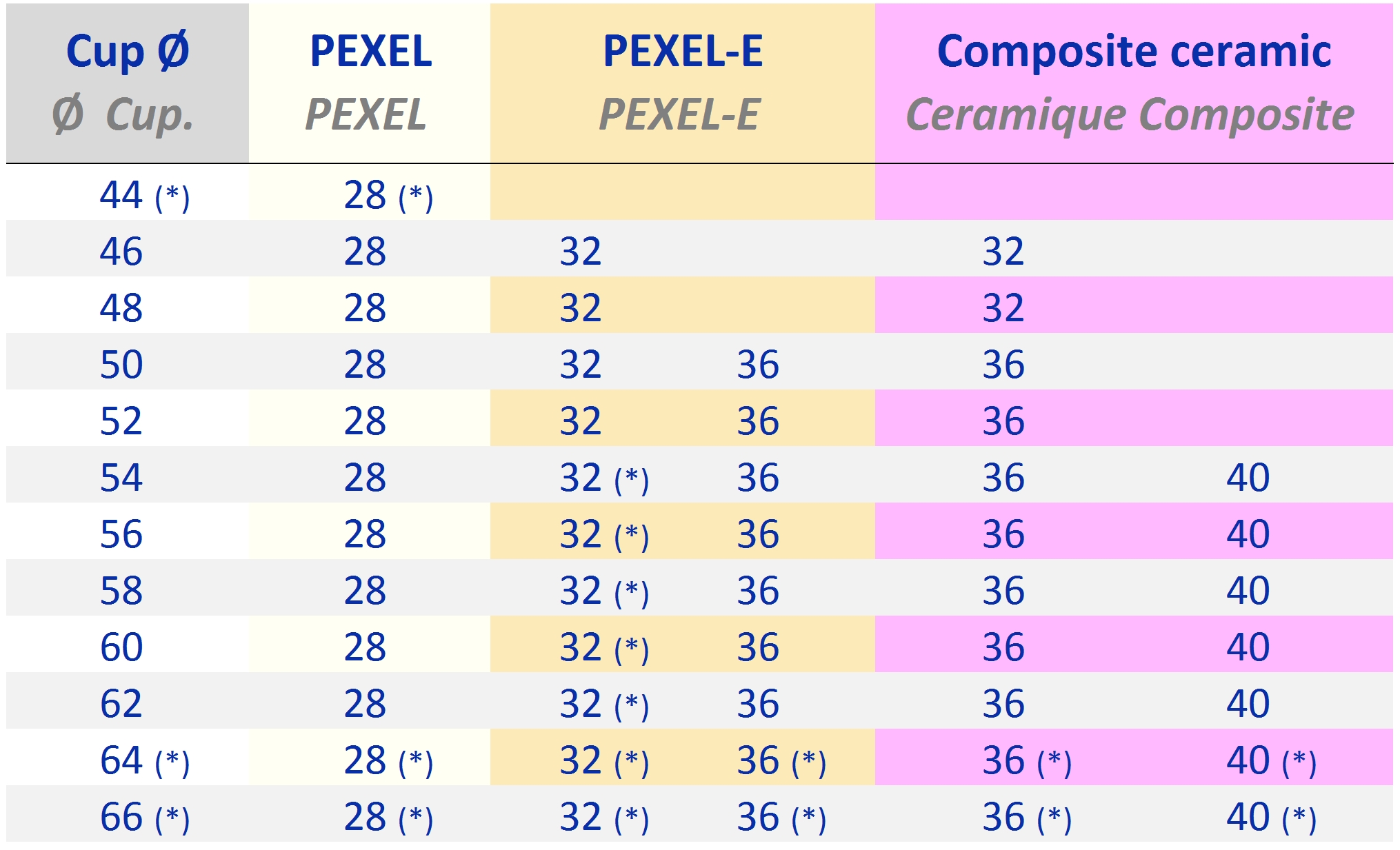 - Insertos con voladizo en diámetro interno 28 en polietileno “PEXEL” para las indicaciones de artroplastia total en el paciente anciano
